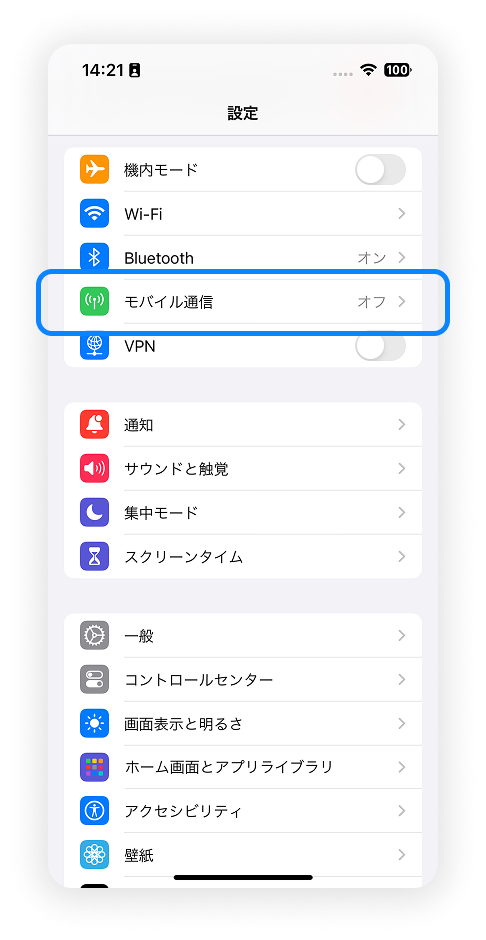 1. 設定アプリを開いて「モバイル通信」を開く