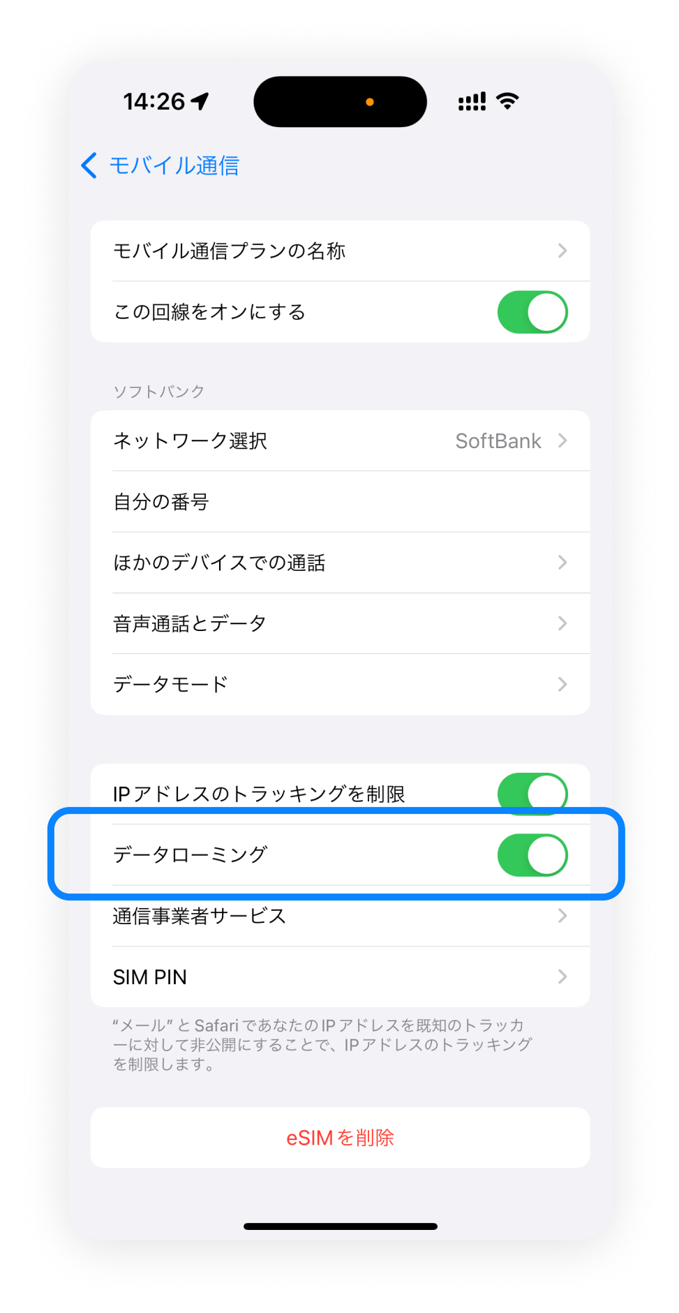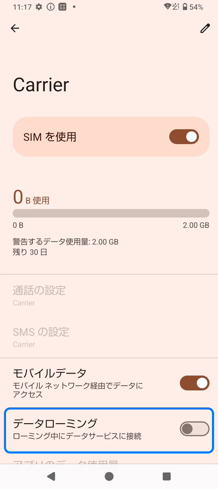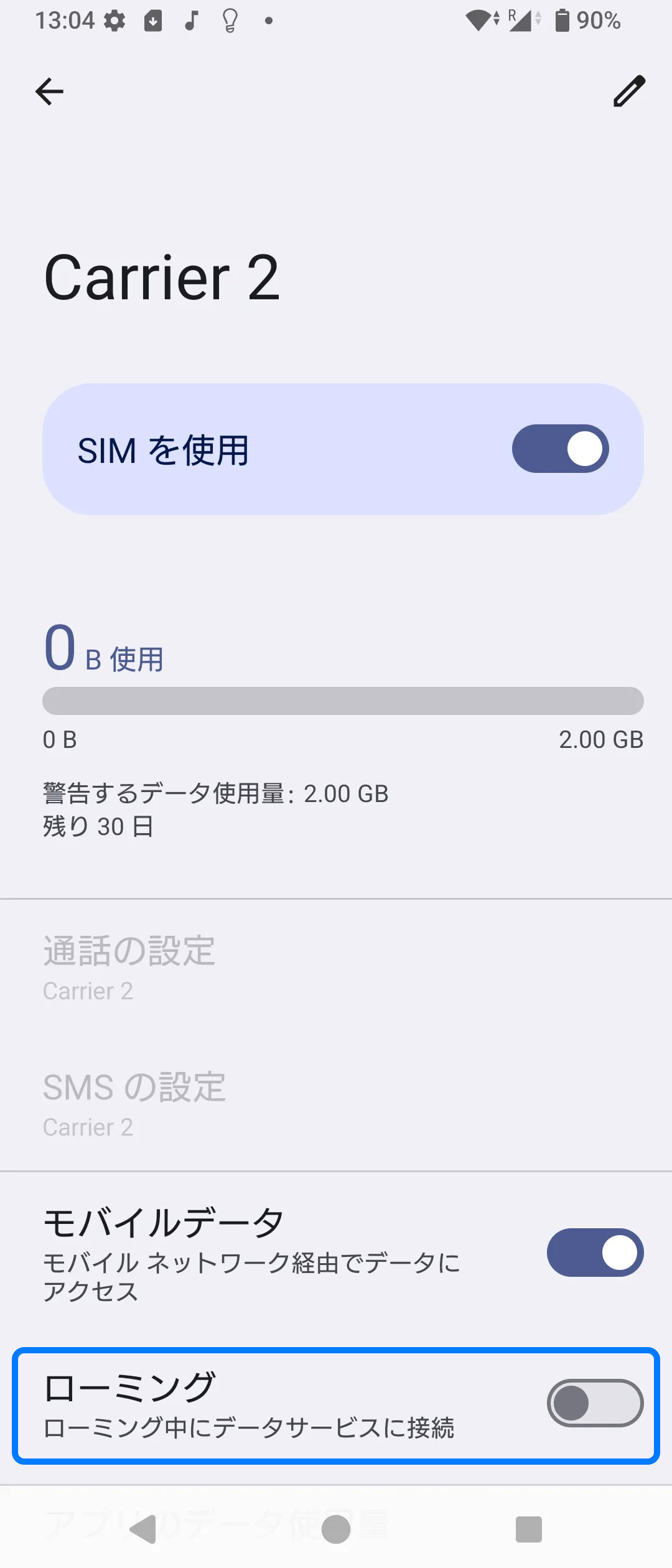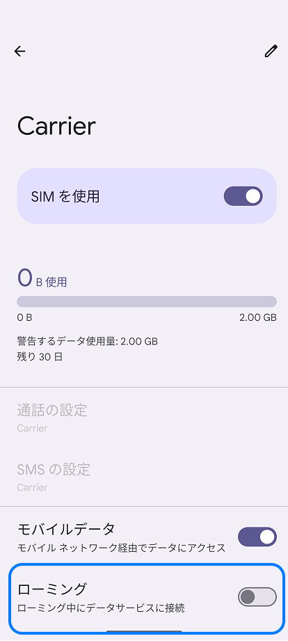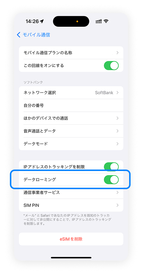 2. 「データローミング」をオンにする