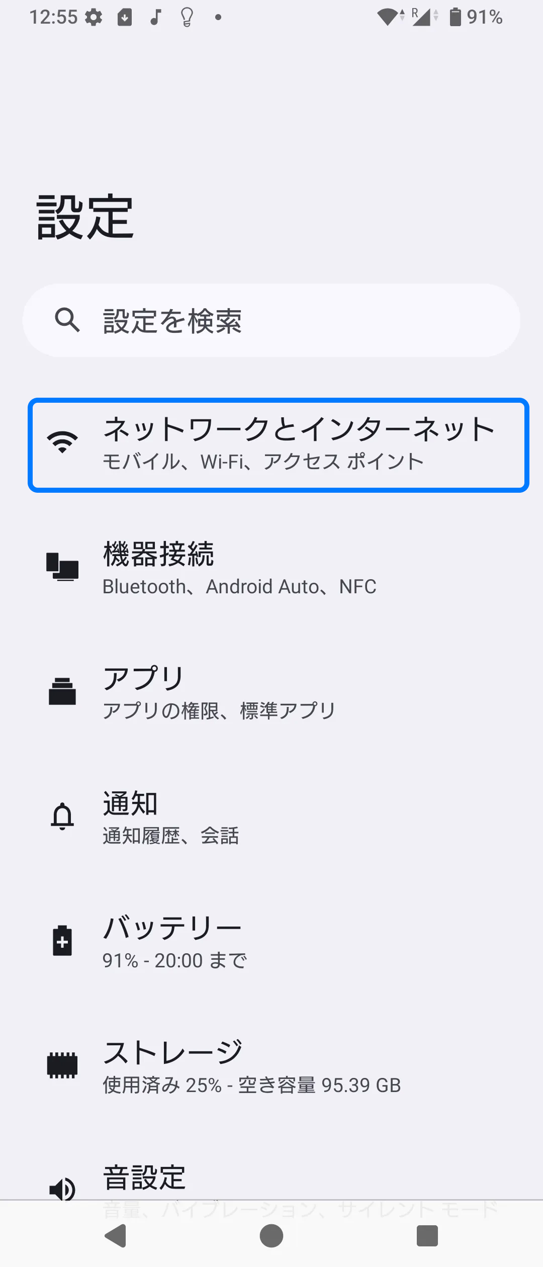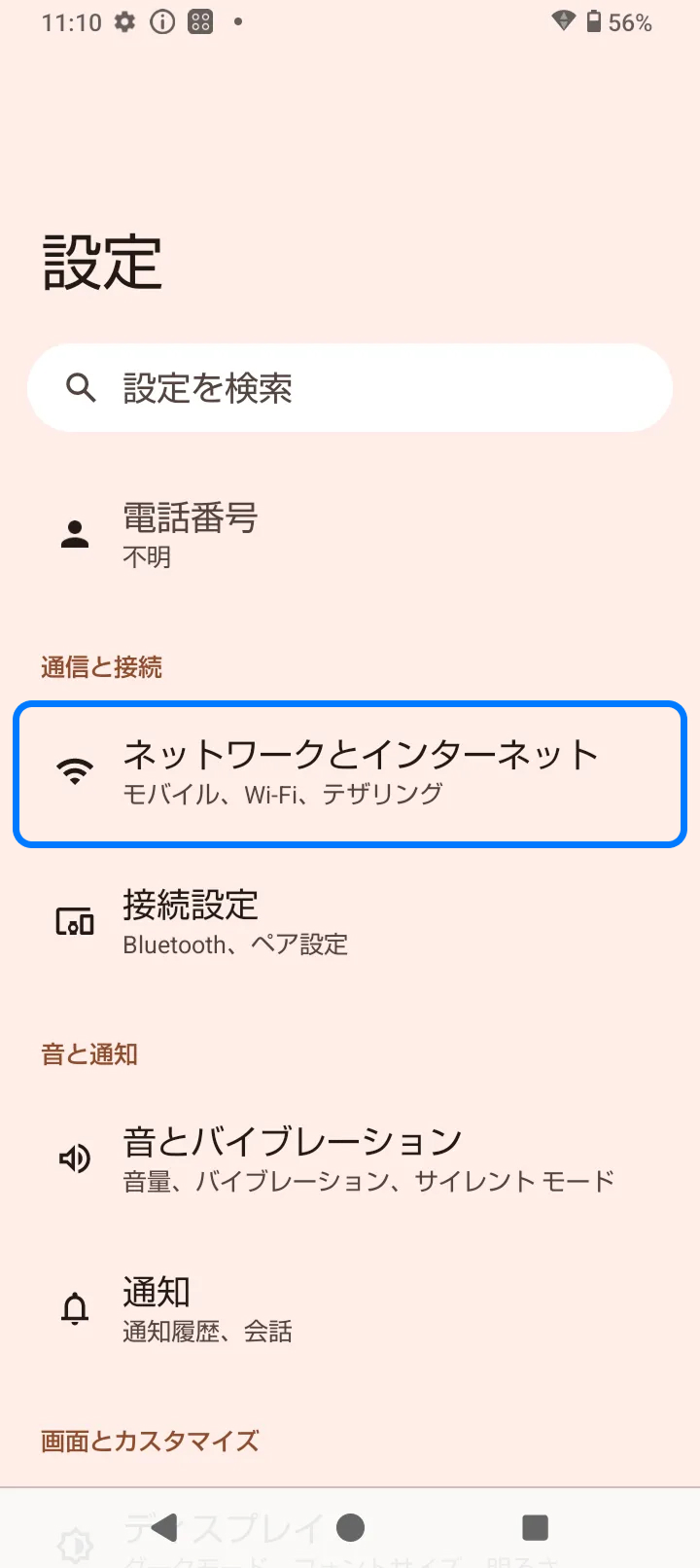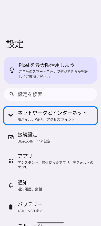 1. 設定アプリを開いて「ネットワークとインターネット」を開く
