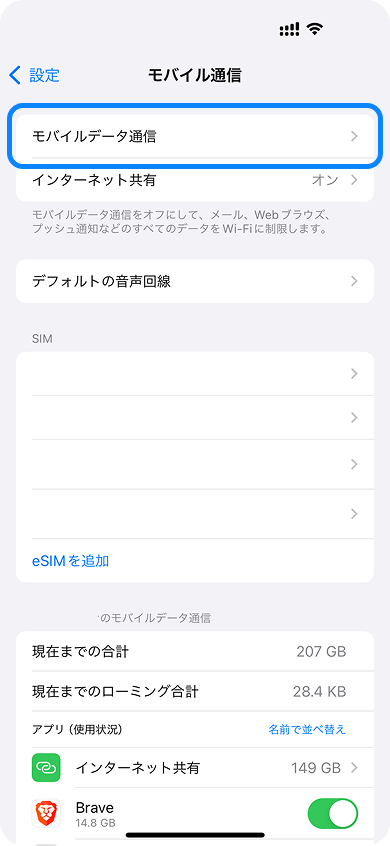 7. 「モバイルデータ通信」を開く